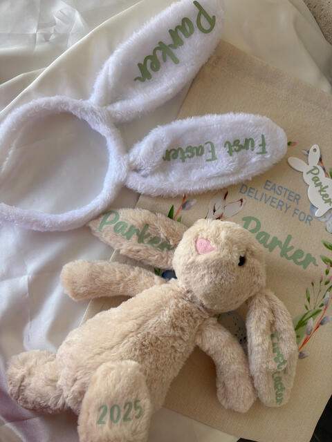 A beautiful personalised Easter keepsake set featuring custom bunny ears, acrylic bag tag, plush bunny and Easter bag.Perfect for first Easters, photos and yearly memories, fully personalised.