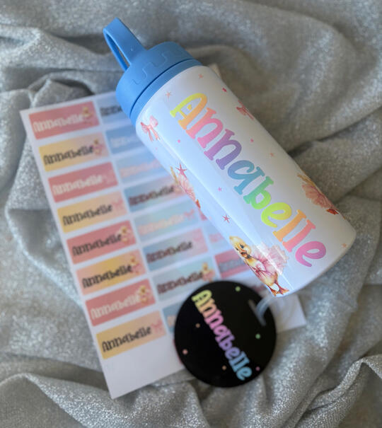 Includes a personalised 600ml insulated water bottle, acrylic bag tag & 25 5cm waterproof name labels.Personalised, practical, durable and custom designed to suit every child’s style.