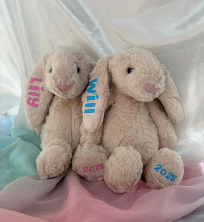 These soft, 25cm bunnies come in a range of classic and flower colors.Perfect for Easter, birthdays, keepsakes or any other occasion!
