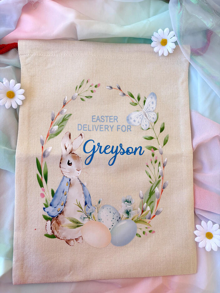 Our adorable personalised Easter sack baskets are 36cm in height and 26cm in width making them big enough for egg hunts, to hold all Easter gifts, chocolate, and more!