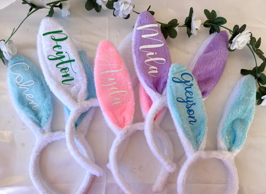A beautiful personalised Easter keepsake set featuring custom bunny ears, acrylic bag tag, plush bunny and Easter bag.Perfect for first Easters, photos and yearly memories, fully personalised.